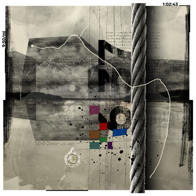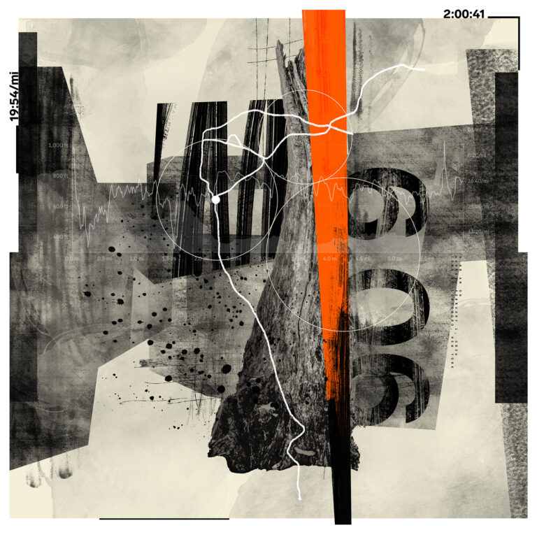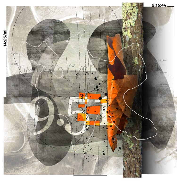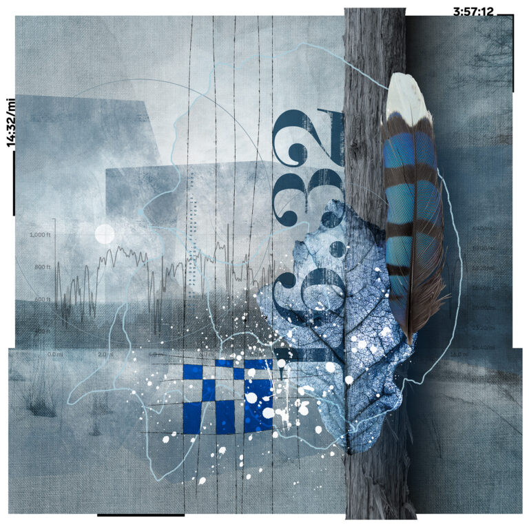 Starting January 1, 2023, the All These Miles series encapsulates a distinctive approach to artistic creation by seamlessly merging the physicality of trail running with the intricacies of visual storytelling. Each piece in the series tells the story of a single trail run, capturing elements such as distance, elevation, route, time, landscape photography, and discovered objects. Sometimes snippets of conversation, a thought, or headlines of the day make their way into the work.