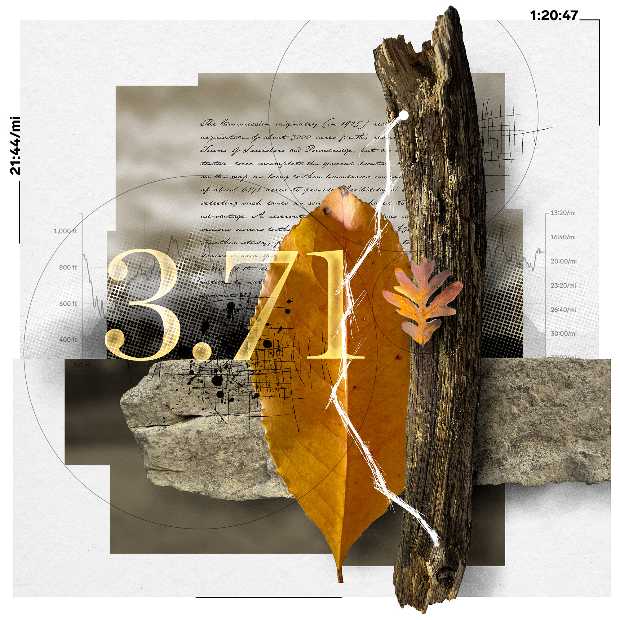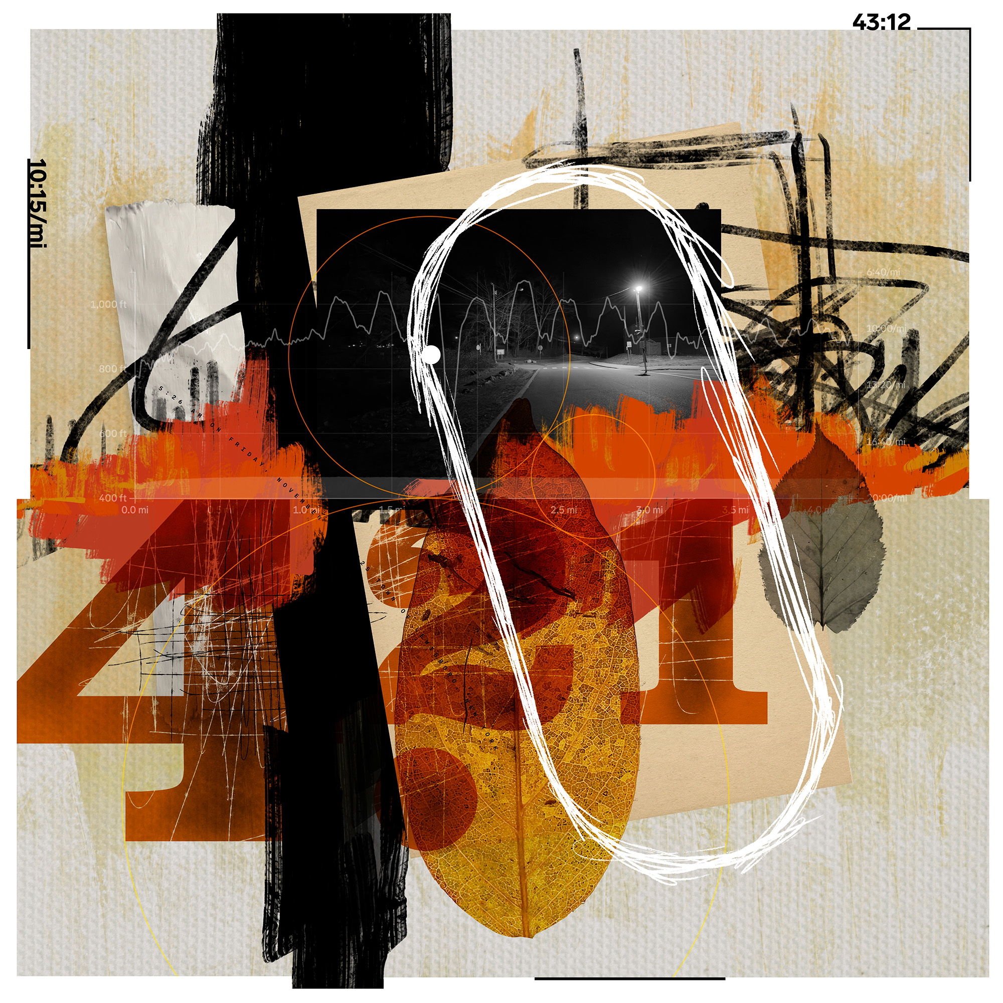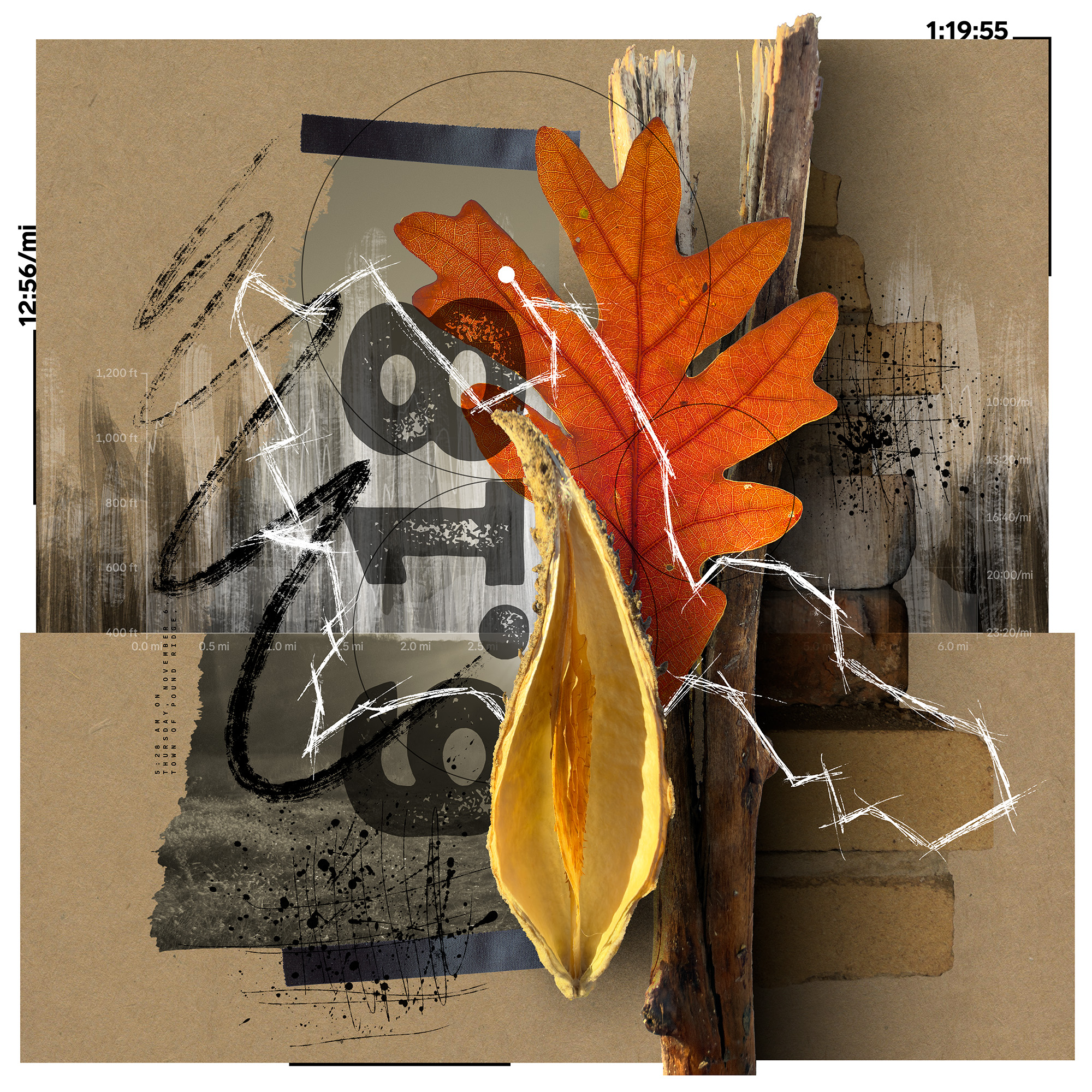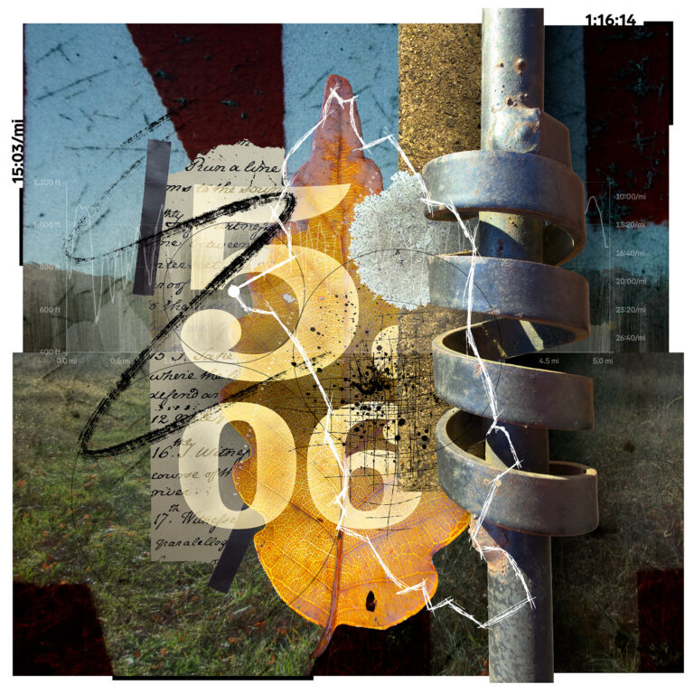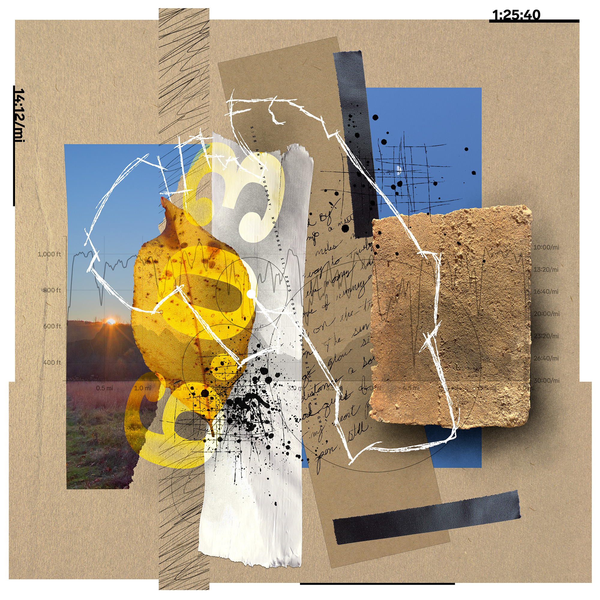 Starting January 1, 2023, the All These Miles series encapsulates a distinctive approach to artistic creation by seamlessly merging the physicality of trail running with the intricacies of visual storytelling. Each piece in the series tells the story of a single trail run, capturing elements such as distance, elevation, route, time, landscape photography, and discovered objects. Sometimes snippets of conversation, a thought, or headlines of the day make their way into the work.