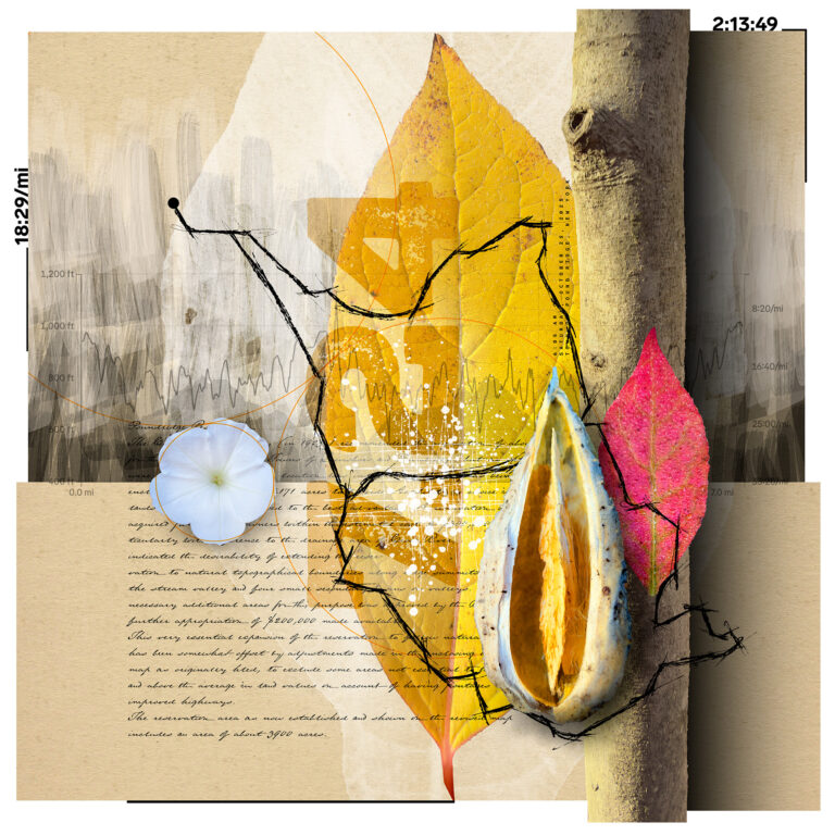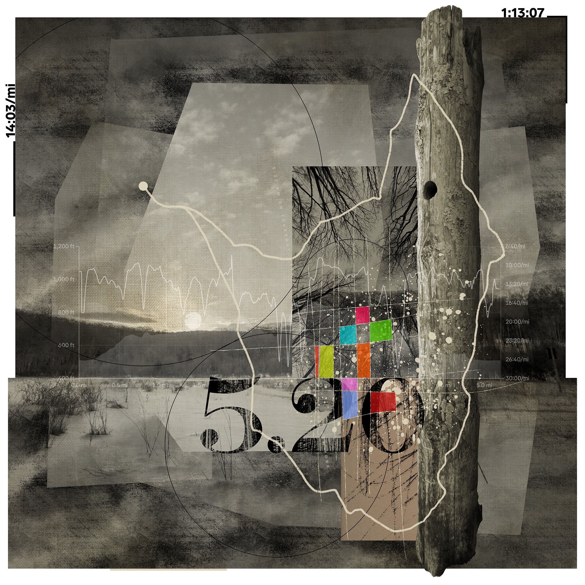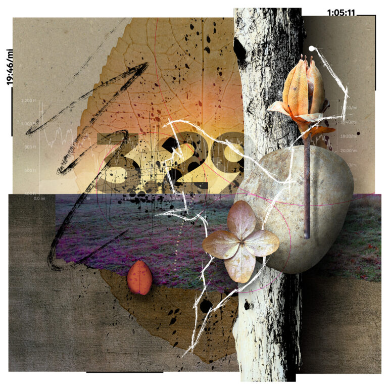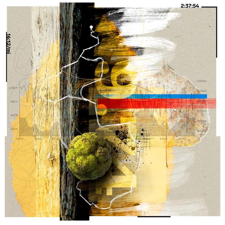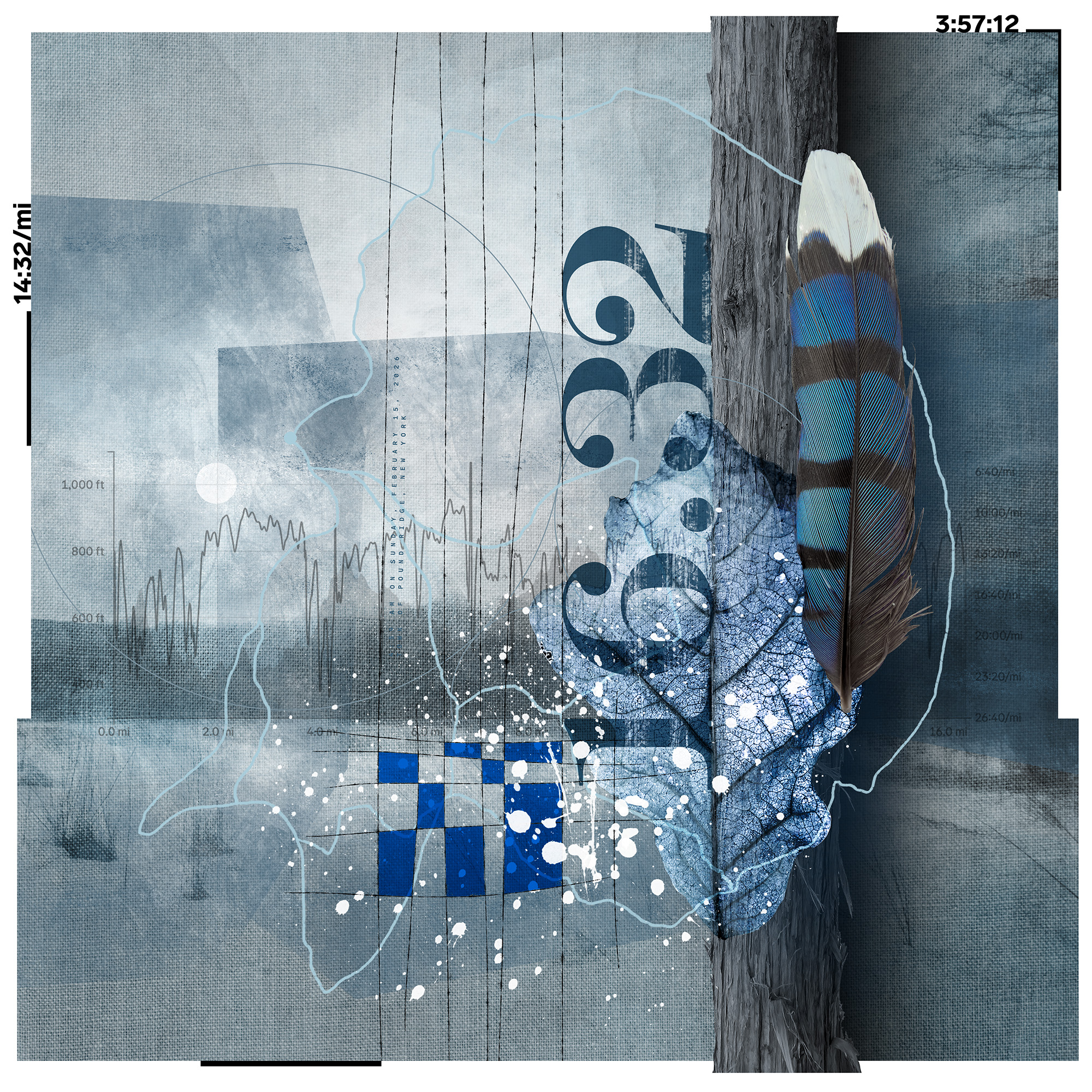 Starting January 1, 2023, the All These Miles series encapsulates a distinctive approach to artistic creation by seamlessly merging the physicality of trail running with the intricacies of visual storytelling. Each piece in the series tells the story of a single trail run, capturing elements such as distance, elevation, route, time, landscape photography, and discovered objects. Sometimes snippets of conversation, a thought, or headlines of the day make their way into the work.