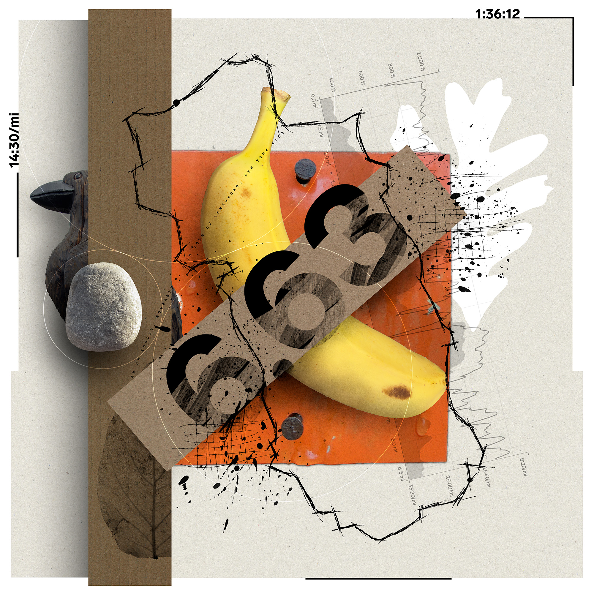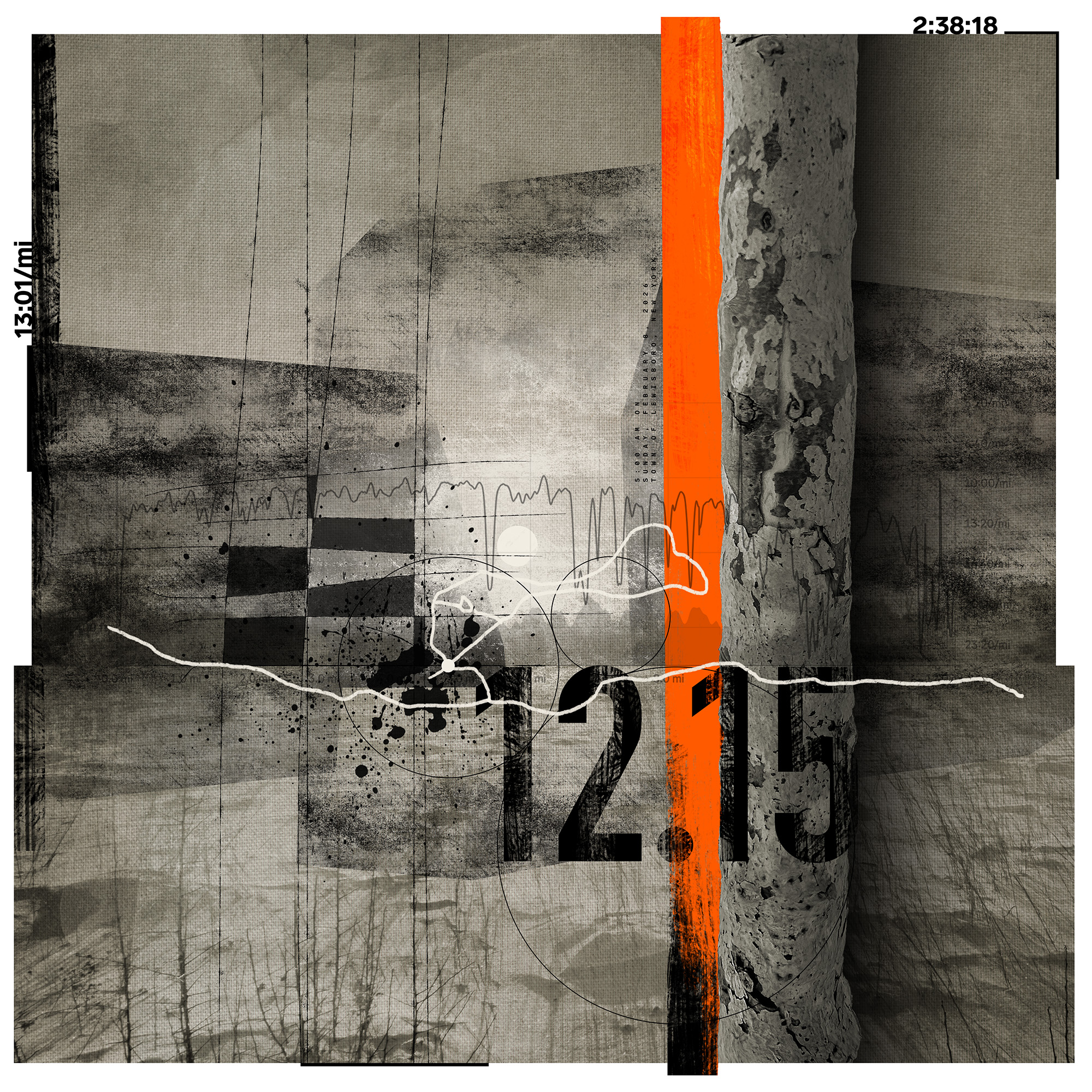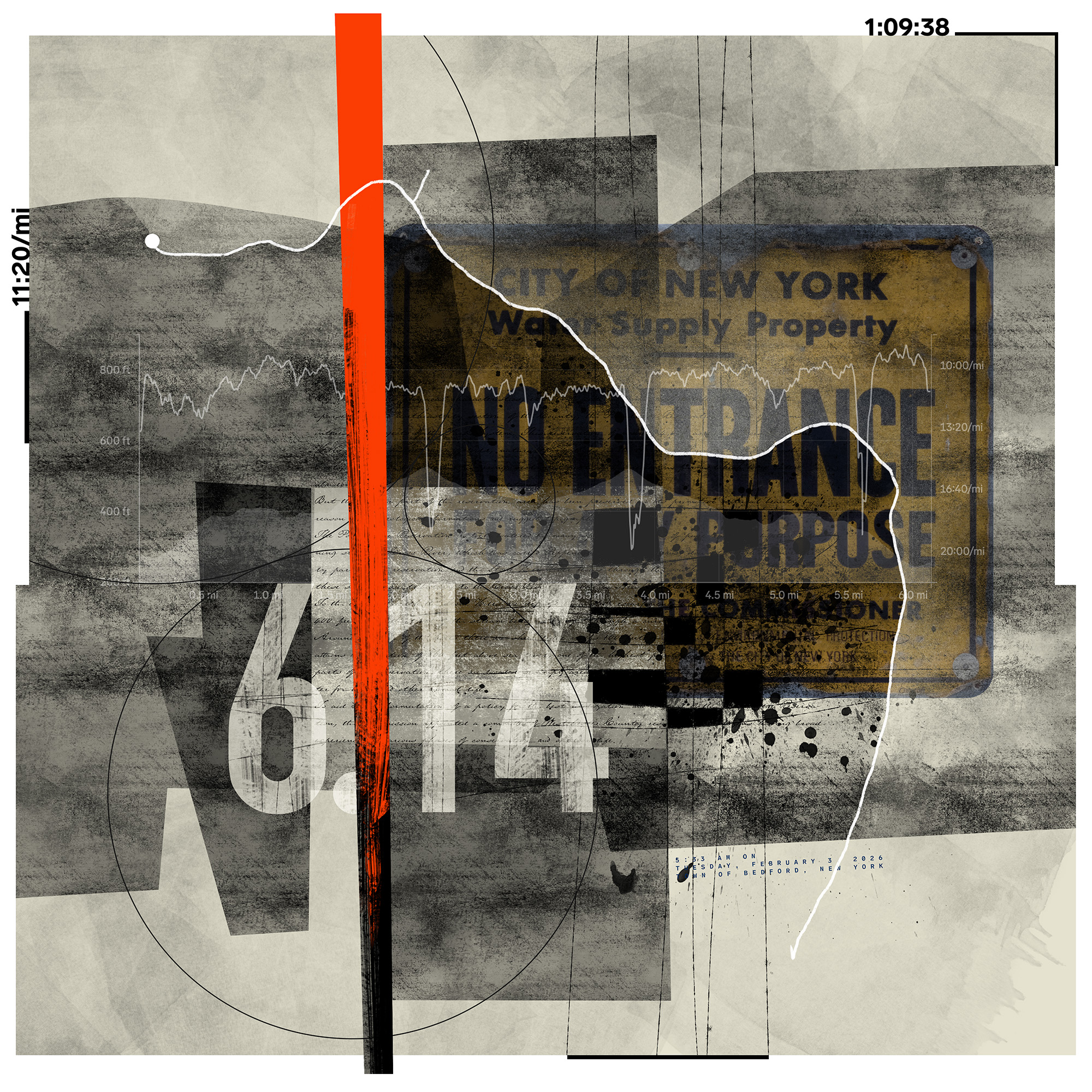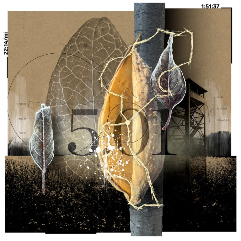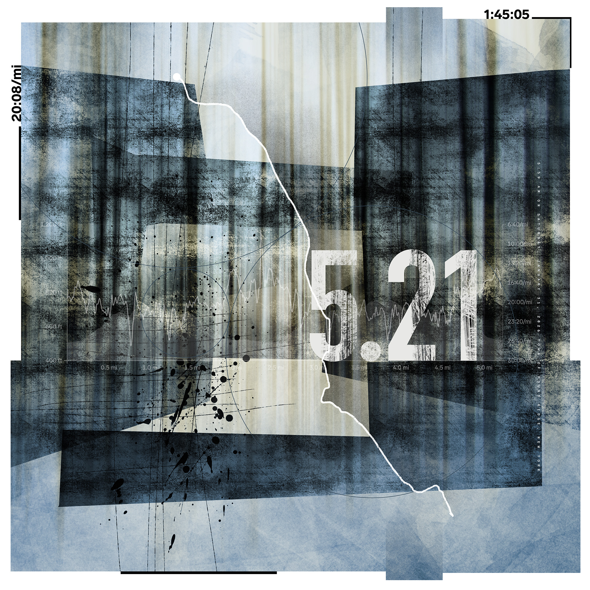 Starting January 1, 2023, the All These Miles series encapsulates a distinctive approach to artistic creation by seamlessly merging the physicality of trail running with the intricacies of visual storytelling. Each piece in the series tells the story of a single trail run, capturing elements such as distance, elevation, route, time, landscape photography, and discovered objects. Sometimes snippets of conversation, a thought, or headlines of the day make their way into the work.